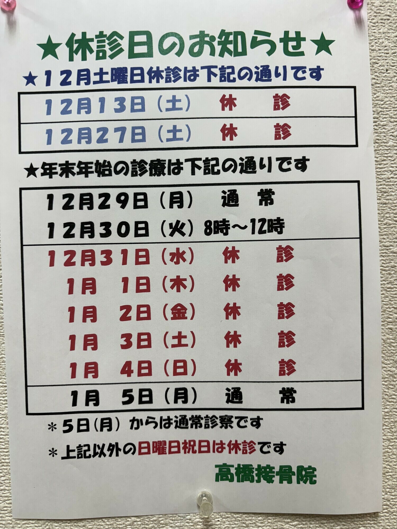 高橋接骨院本院の12月と年末年始の予定をお知らせします!